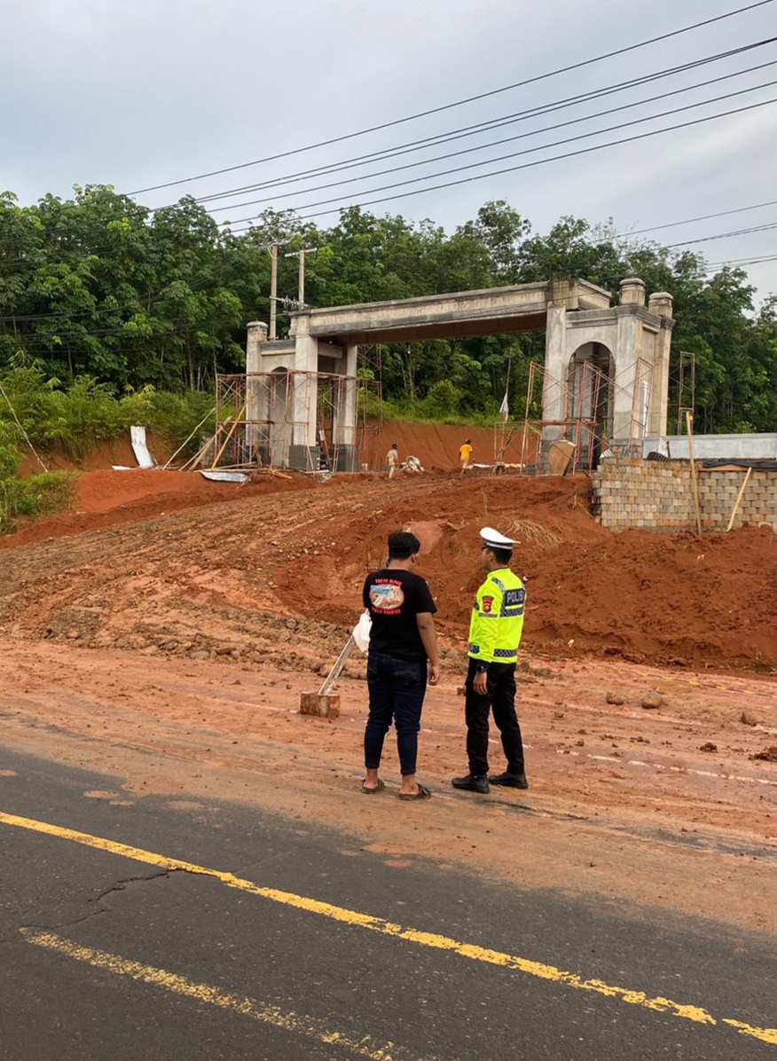 Personel Satlantas Polres Musi Rawas, mendatangi langsung lokasi pekerjaan untuk melakukan pengecekan serta mengingatkan pihak kontraktor dan pekerja lapangan agar segera membersihkan tanah yang tercecer.