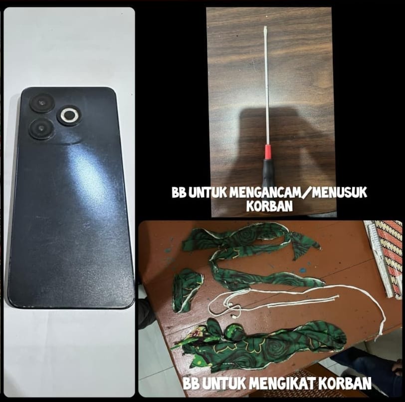 Kemudian setelah pintu terbuka, pelaku “S” bertanya dimana kunci rolling door dan “API” memberitahukan bahwa kunci disimpan diruangan sebelah, sehingga pelaku “S” pun menyeret “API” ke ruangan sebelah untuk mengambil kunci rolling door. Setelah mengambil kunci rolling door mereka mengambil barang – barang milik korban “IK” dan dibawa lari oleh para Tersangka yakni HP merk Infinix Smart 8, uang Tunai sebanyak Rp 850.000, tas selempang dan celana.