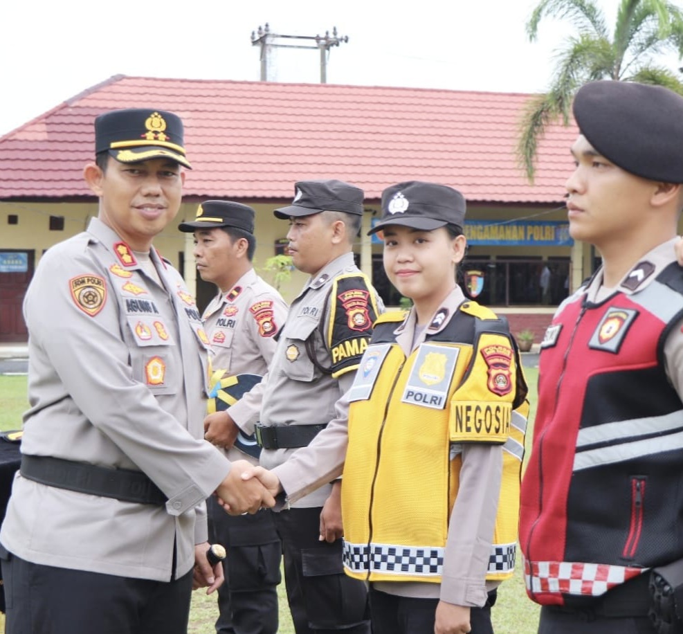 Saat apel launching, Kapolres Musi Rawas, memberikan kunci kendaraan Pamapta, dan pemasangan bead personel Pamapta, Negosiator dan Patroli Presisi.